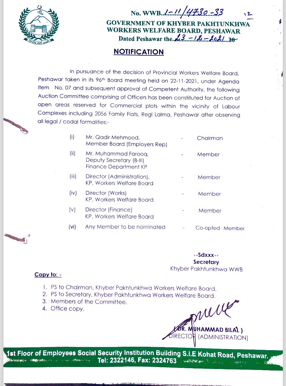 Auction Committee has been constituted for auction of open areas, reserved for Commercial plots within the vincity of Labour Complexes including 2056 Family Flats, Regi Lalma, Peshawar after observing at legal / codal formalities.
